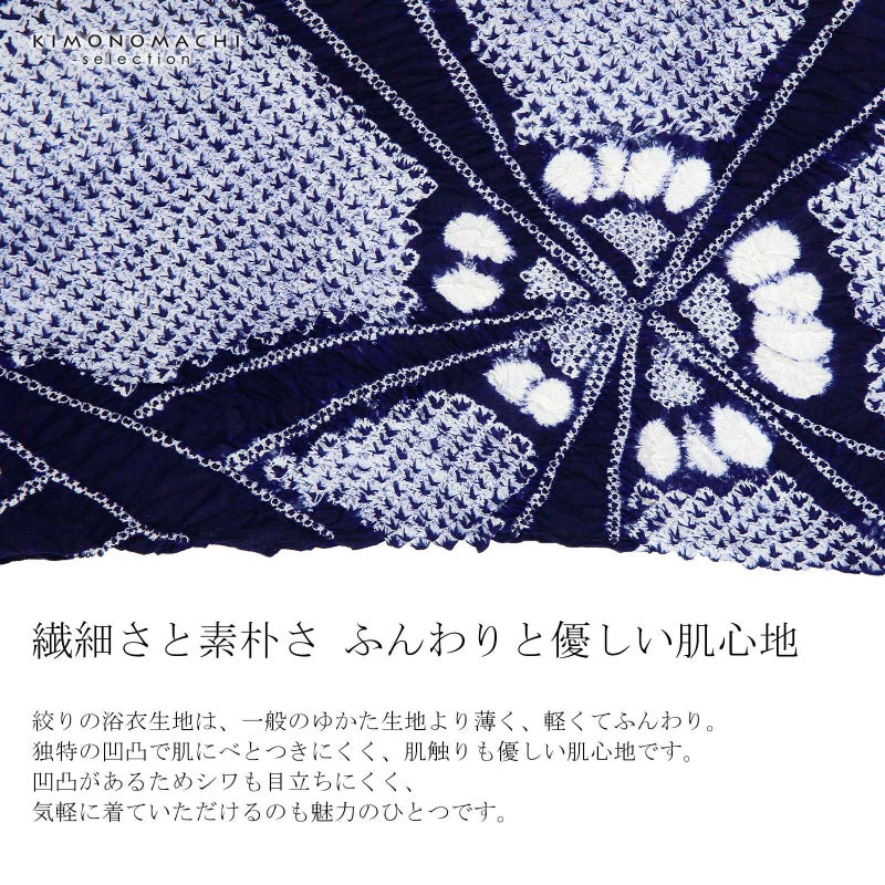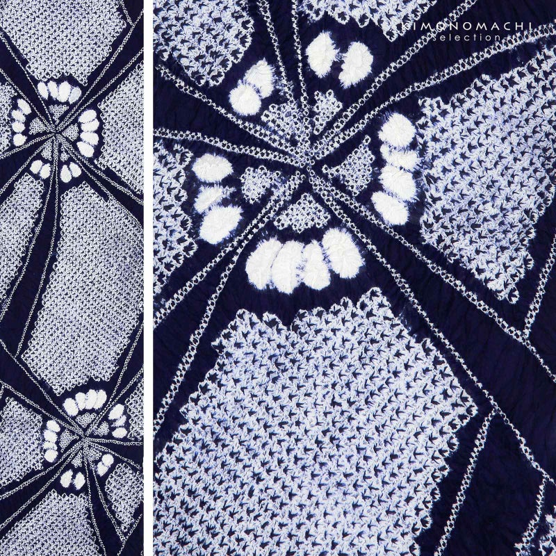 【色柄】濃紺地に白のいろいろな絞りの技法を組み合わせて表現された幾何学調の花火。際立った印象にしてくれます。