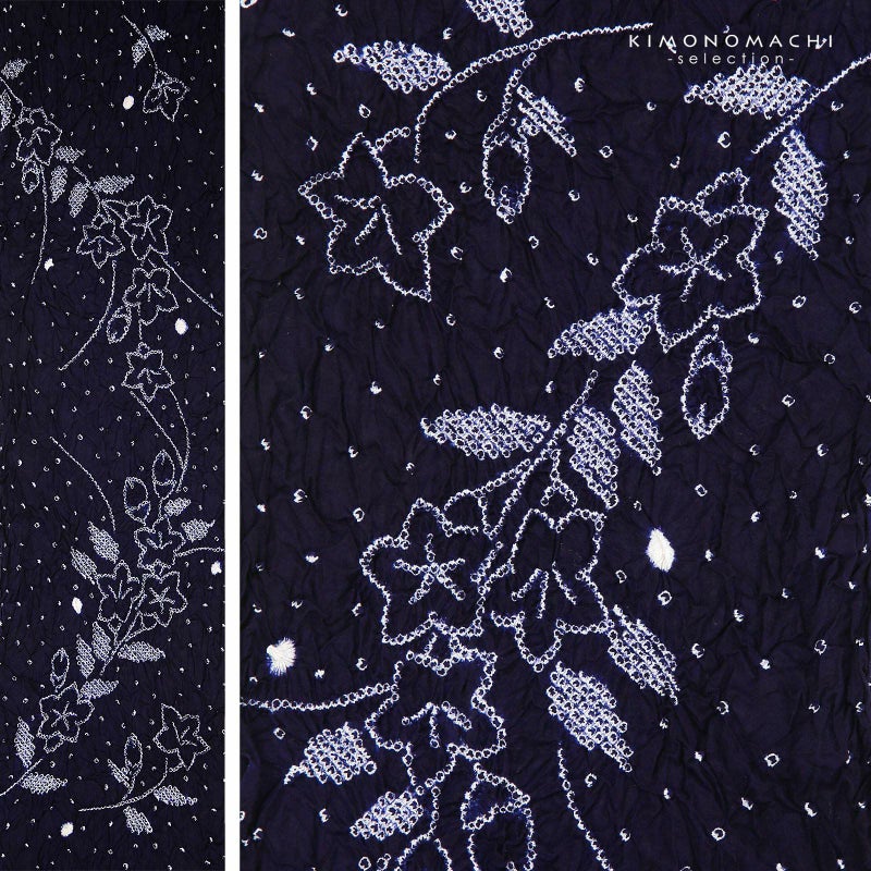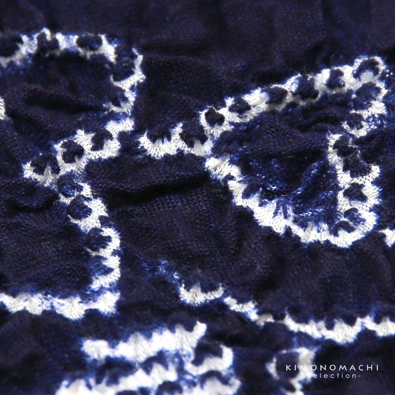 【色柄】濃紺に白の鹿の子を散らした地。細かな絞りを連ねて表現した桔梗のお花。