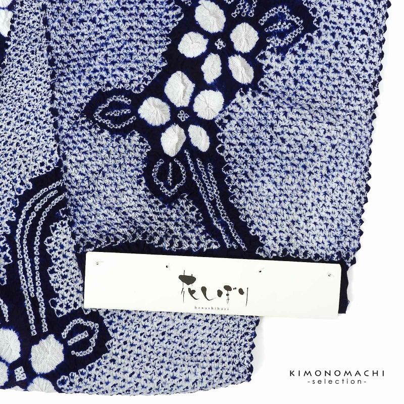 【色柄】濃紺に三浦絞りを並べた地。ひと目絞りを連ねて表現された蔓に、ニチニチソウのようなお花が流れるように配置されています。