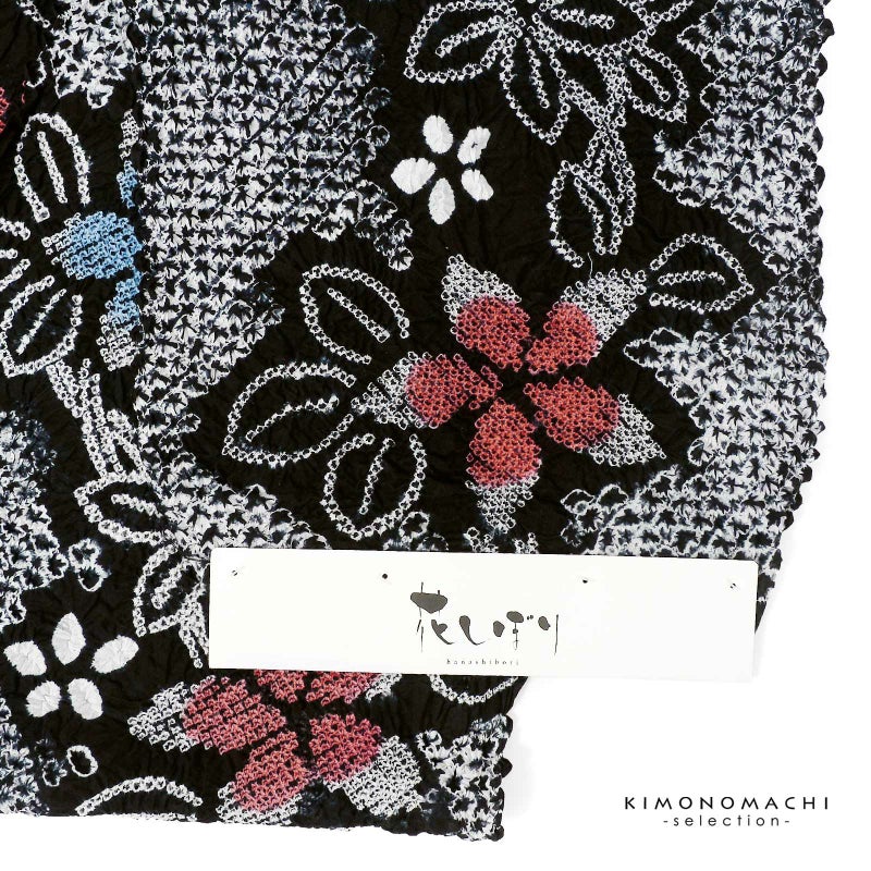 【色柄】黒に三浦絞りを並べた地。いろいろな絞りを組み合わせた流水に白いお花が流れるように配置されています。お花に薄赤と青の挿し色。