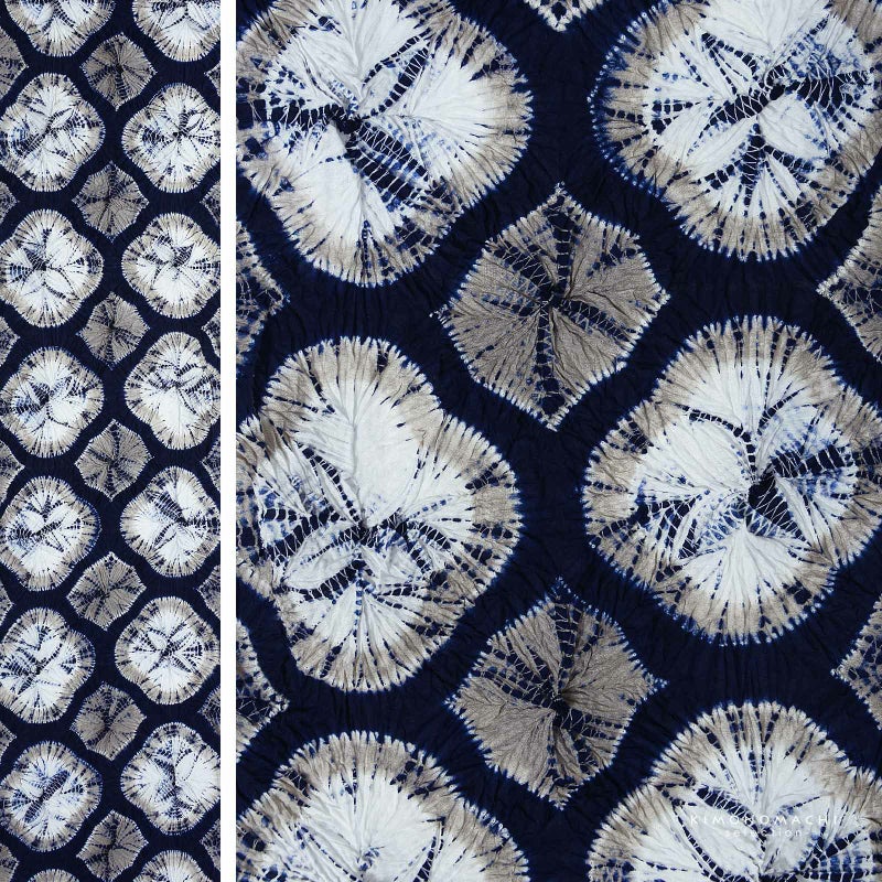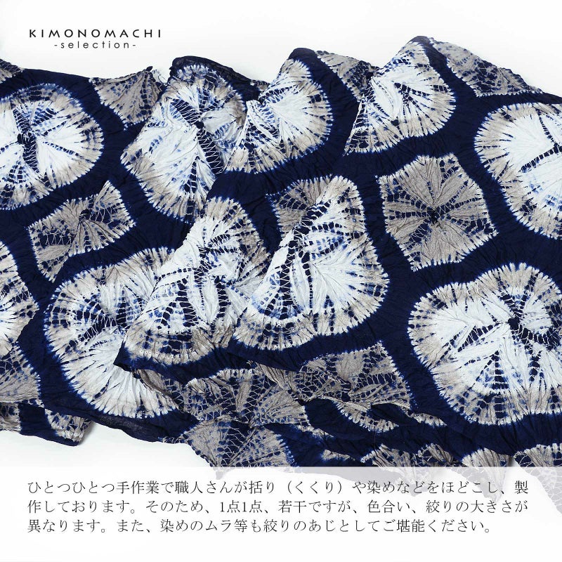 ※ひとつひとつ手作業で職人さんが括り(くくり)や染めなどをほどこし、製作しております。そのため、1点1点、若干ですが、色合い、絞りの大きさが異なります。また、染めのムラ等も絞りのあじとしてご堪能ください。