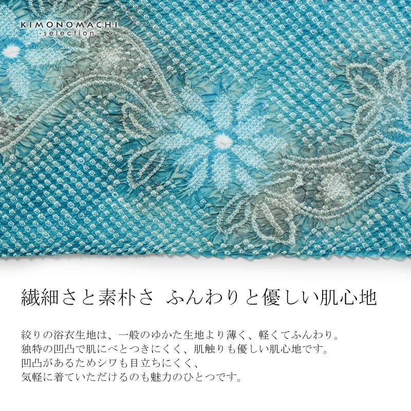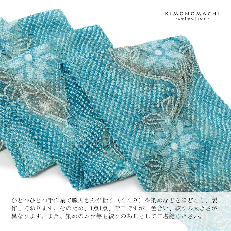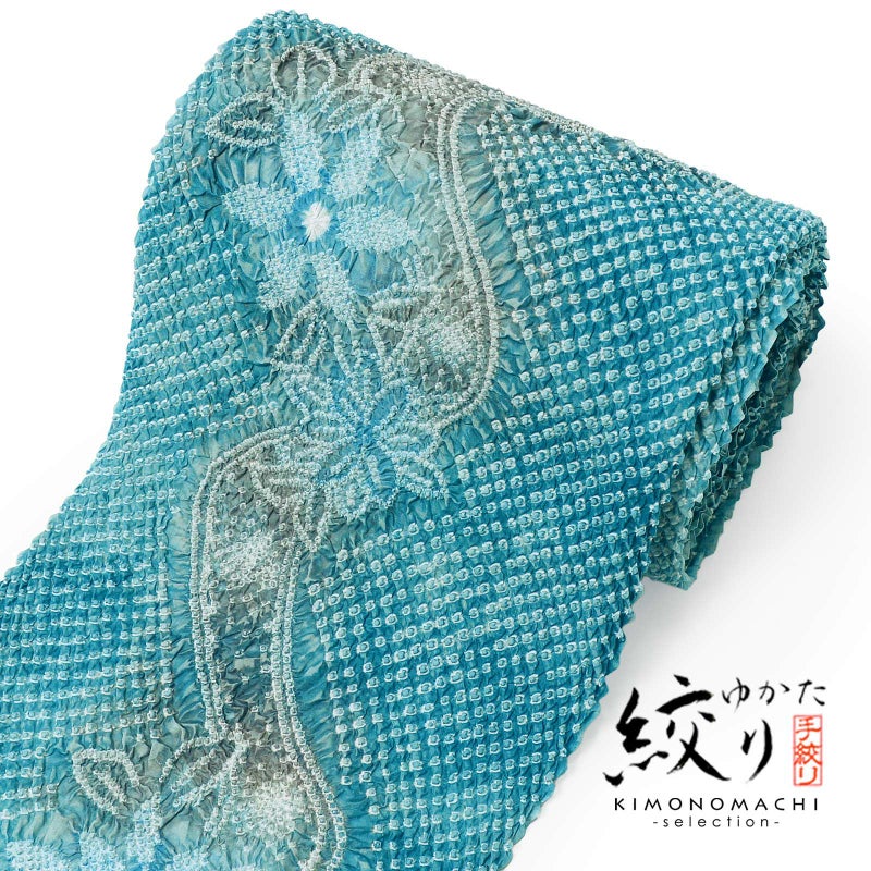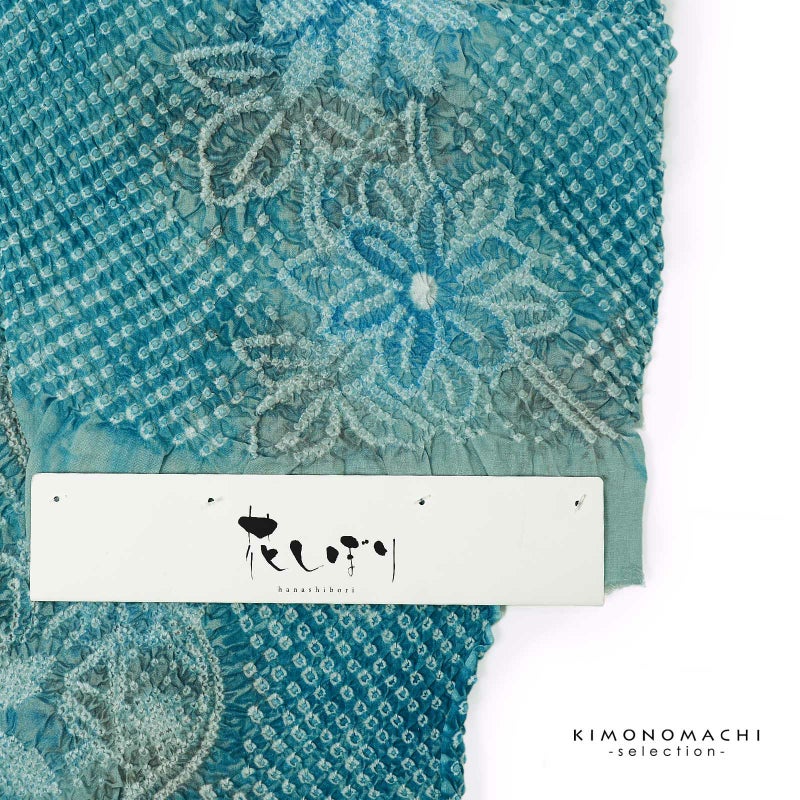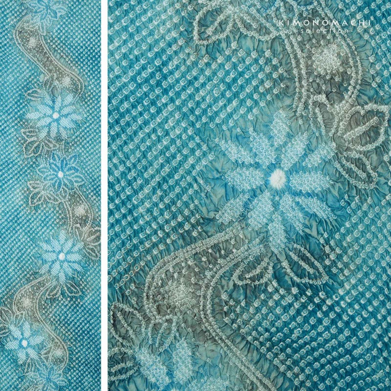 【色柄】濃淡のある青緑色に鹿の子を並べた地。ひと目絞りを連ねて表現された流水にお花。グレーの挿し色。
