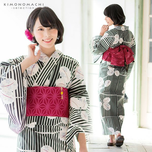 【浴衣カラー】浴衣は黒色の縞に、露芝、萩模様。黒色の花のシルエット模様。帯はやや赤紫系の、ラズベリーレッドの色合い。