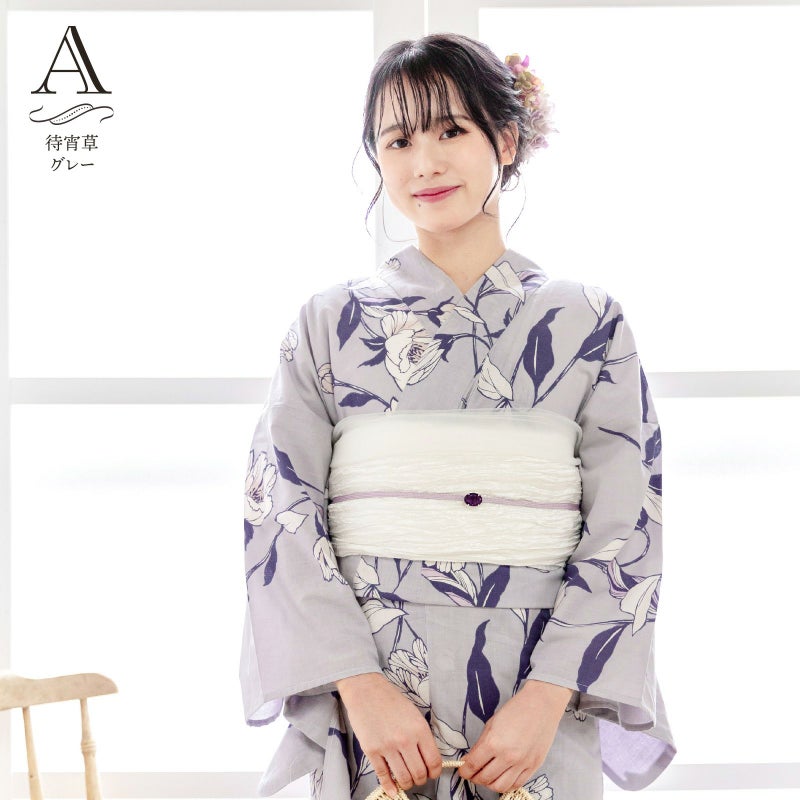 浴衣:わずかに赤みのグレー地、鈍い青紫色の線に白い花びら、ほんのり淡いくすみピンクや薄紫の挿し色が入った待宵草のようなお花。