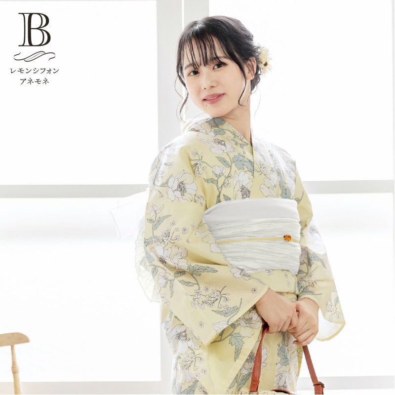 浴衣:淡く明るい黄色地に黒茶色の線で描かれたアネモネや小花模様。オフホワイトや薄いクリーム色の花びら、リードグレーの葉。