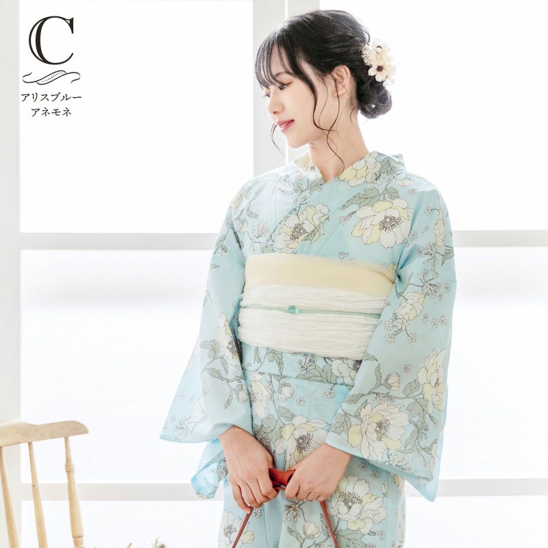 浴衣:ややグレイッシュな淡く明るい水色地に黒茶色の線で描かれたアネモネや小花模様。オフホワイトや薄いクリーム色の花びら、モスグレーの葉。