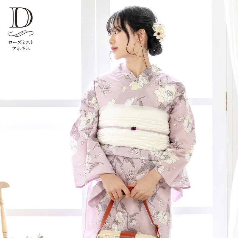 浴衣:グレイッシュな赤紫みのピンク地に黒茶色の線で描かれたアネモネや小花模様。オフホワイトや薄いクリーム色の花びら、ウォームグレーの葉。