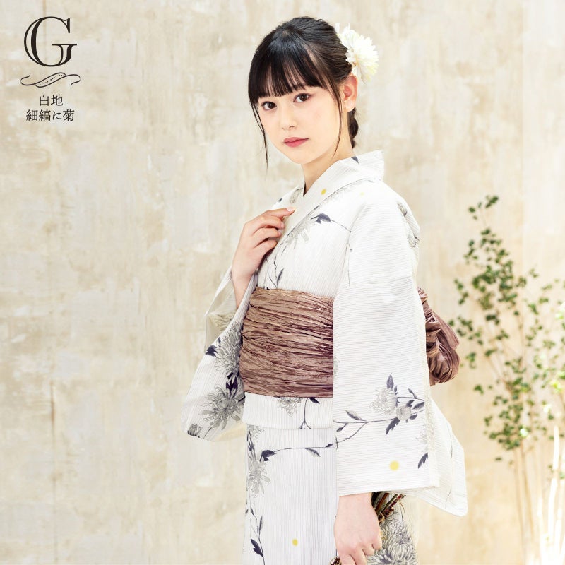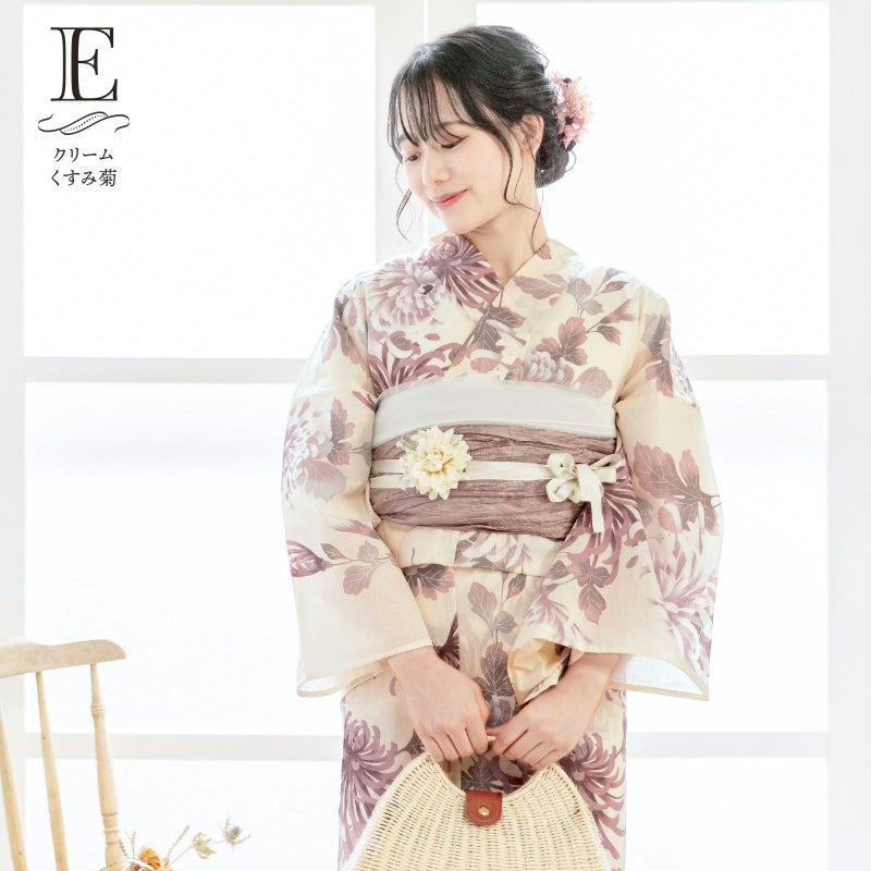 浴衣:やや赤みのクリーム色地にグレイッシュな淡い赤紫色、グレー、くすみピンクや白の菊の花。繊細なぼかしのくすみカラーが今っぽいデザインです。