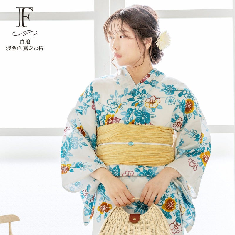 浴衣:白地に濃い浅葱色や水色ぼかしの型染調の椿、桜や露芝の柄。ポイントにからし色や臙脂色。