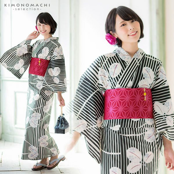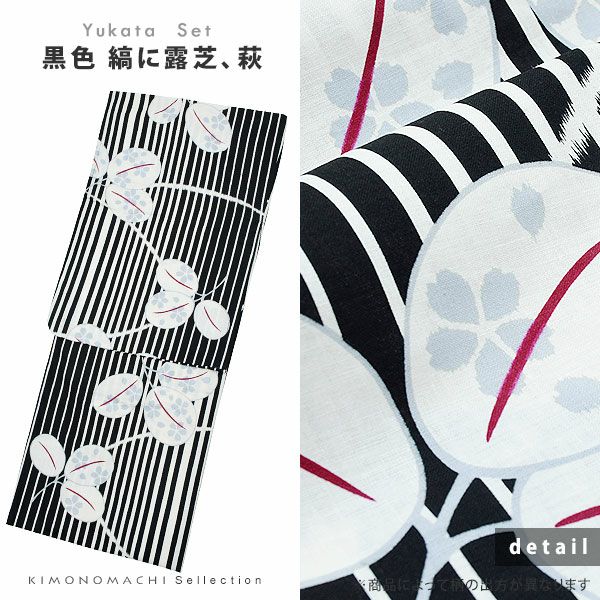 【浴衣カラー】浴衣は黒色の縞に、露芝、萩模様。黒色の花のシルエット模様。帯はやや赤紫系の、ラズベリーレッドの色合い。