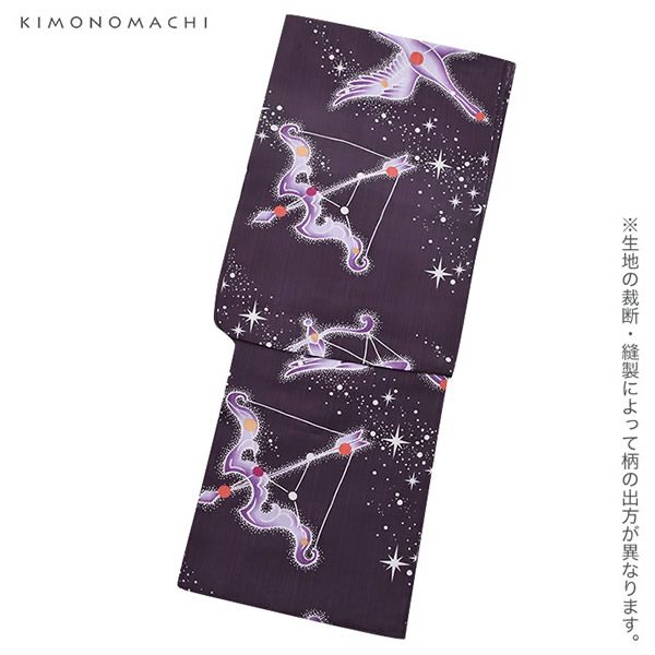 【カラー】浴衣は暗い紫紺色地に、星の輝く空をイメージ。キラキラと輝いているかのような星座モチーフ、濃淡の紫色のグラデーション。帯は白っぽい淡い鼠色地に花火模様。
