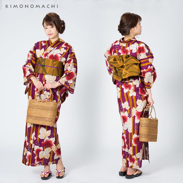 【カラー】浴衣は紫色地に、金茶色のナチュラルな縦ライン。その上に、ごく薄い藤色のラインで縁取られた葡萄蔦模様。葉っぱの部分はアイボリーで、部分的にほんのり濃く、また濃淡のエンジ色で色づいています。赤紫色の葡萄がぷっくり丸くて、可愛らしい。帯は山吹茶色×黒色の色使い、露芝模様。