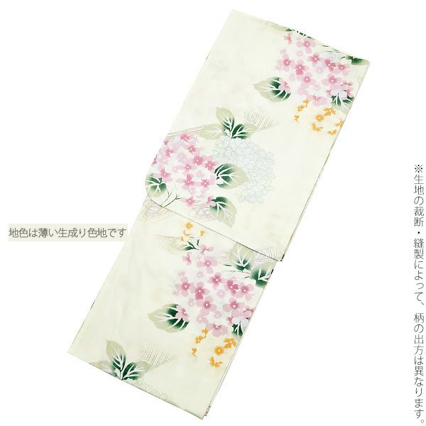 【カラー】浴衣は、生成りみの白色地に、幾何学のような模様。ピンク、オレンジ系の色合いの紫陽花模様。帯は、鮮やかな濃いオレンジ色に蝶々の模様。下駄は、鼻緒は白色地に淡い黄色、赤、オレンジなどの色使いのお花模様。台は焼桐の焦げ茶色。