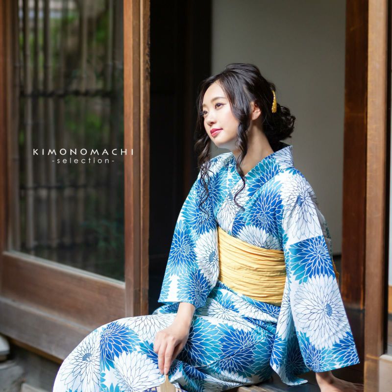 浴衣:ごく薄い生成り地に、ブルー系の色合いの丸菊模様。