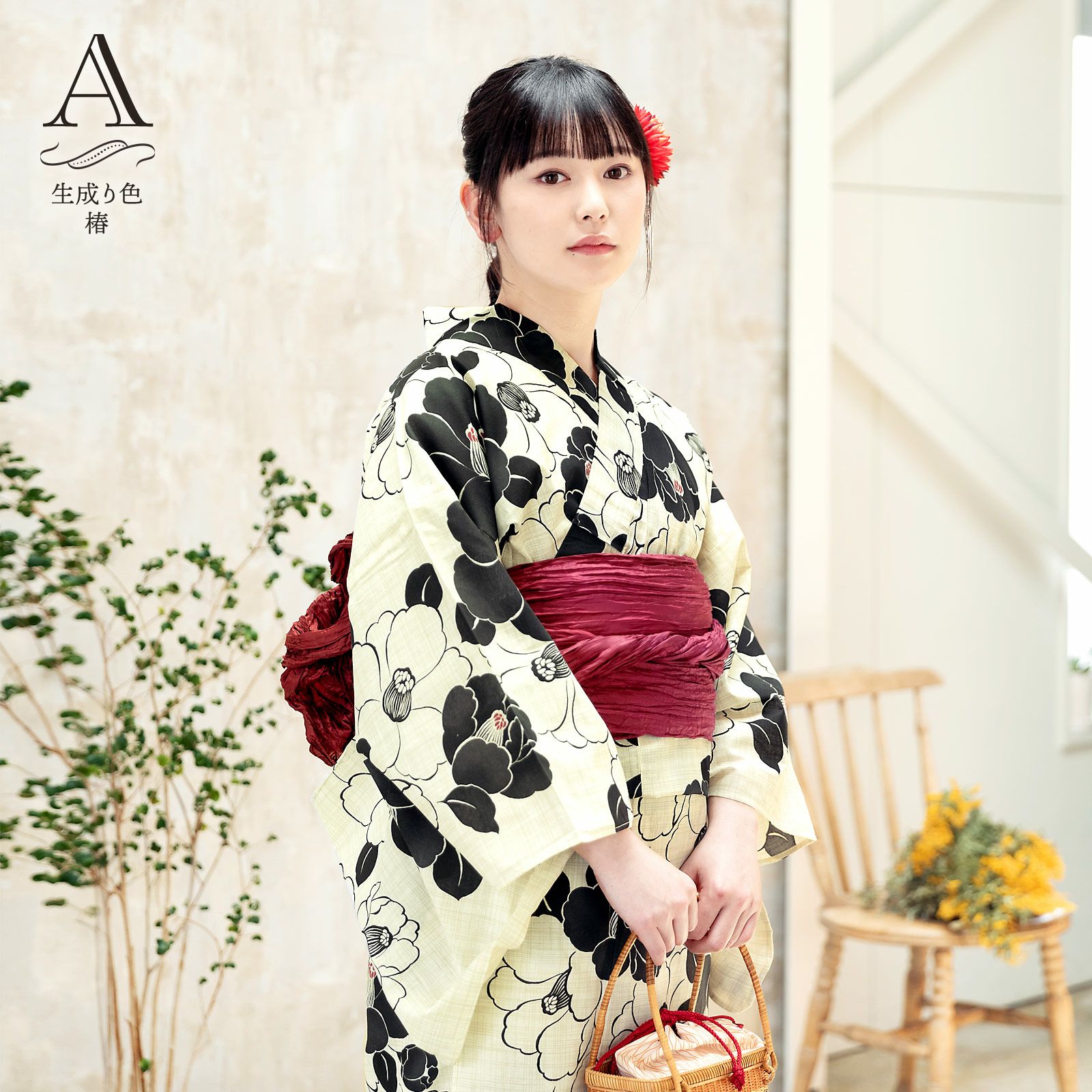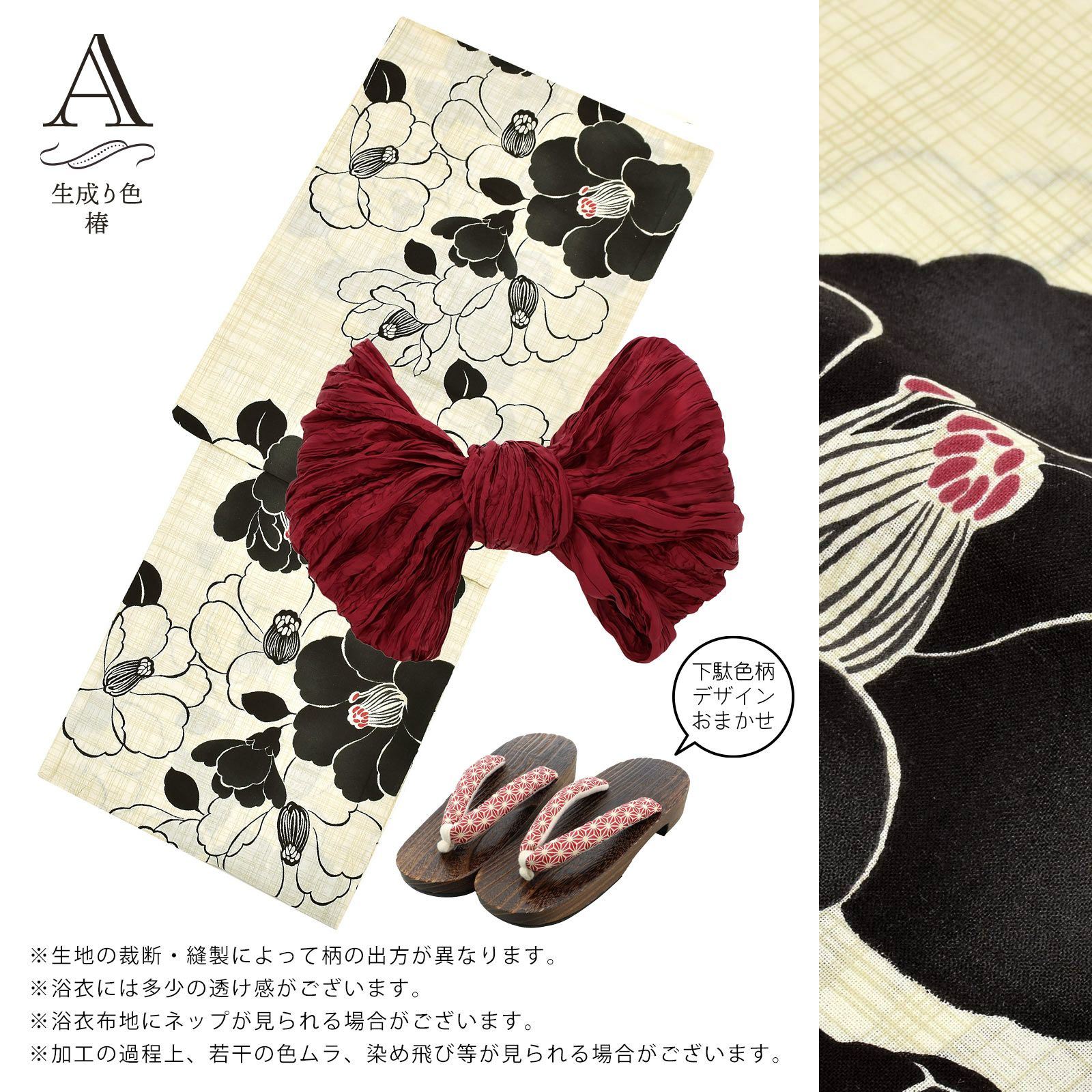 浴衣:生成り色にベージュの細かな格子の地。黒の線で表現された白椿、黒い椿の花。ポイントの蕊に赤紫の挿し色。