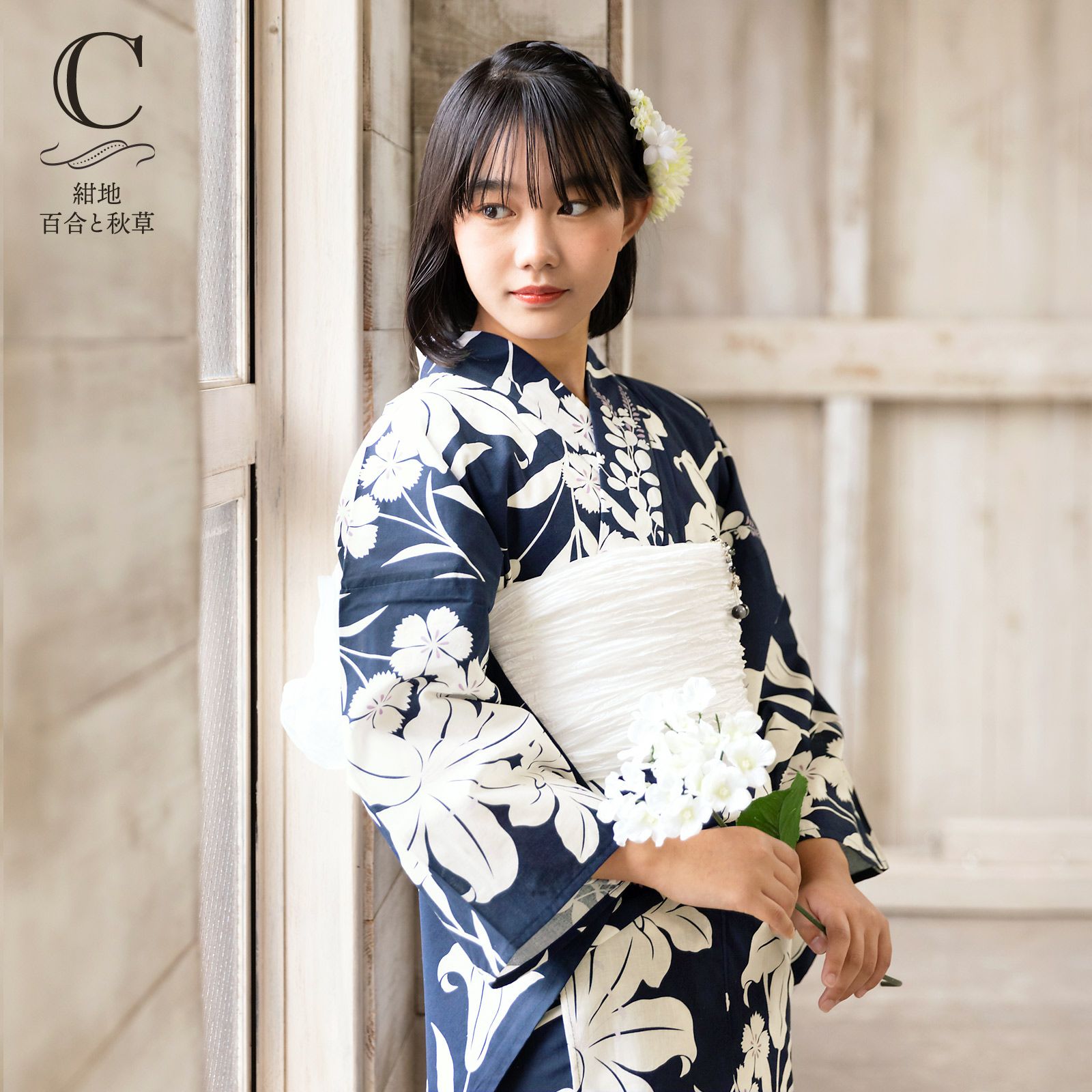 浴衣:濃紺地に白抜きの百合の花に、萩、撫子、女郎花、芝草などの秋草。ポイントに淡い藤色の挿し色。