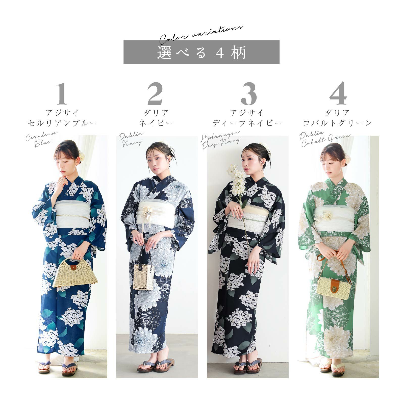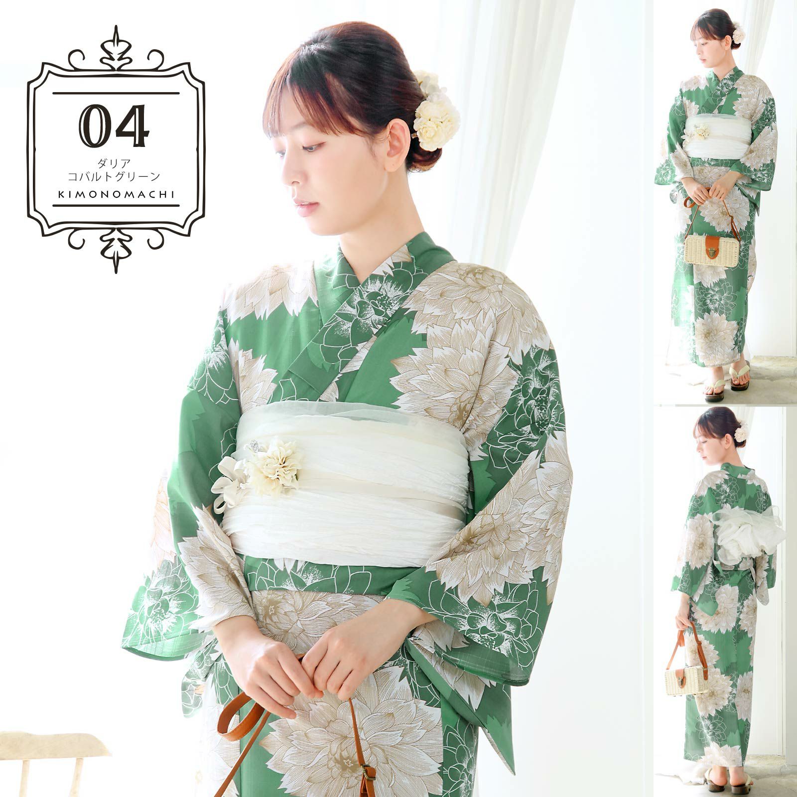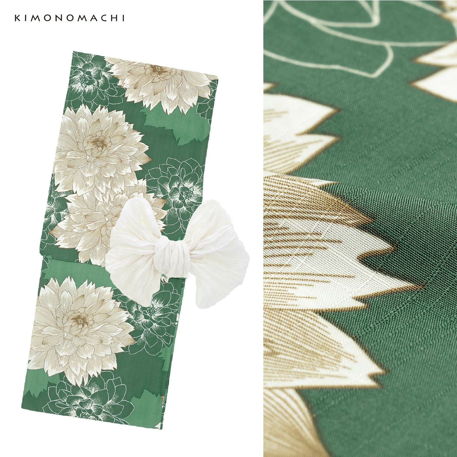 浴衣:グレイッシュなコバルトグリーンの地に、浅緑色の花のシルエット。グレイッシュな薄茶色の線に白で表現された大輪のダリアの花。オフホワイトの輪郭線で表現されたダリアが奥行きを与えています。