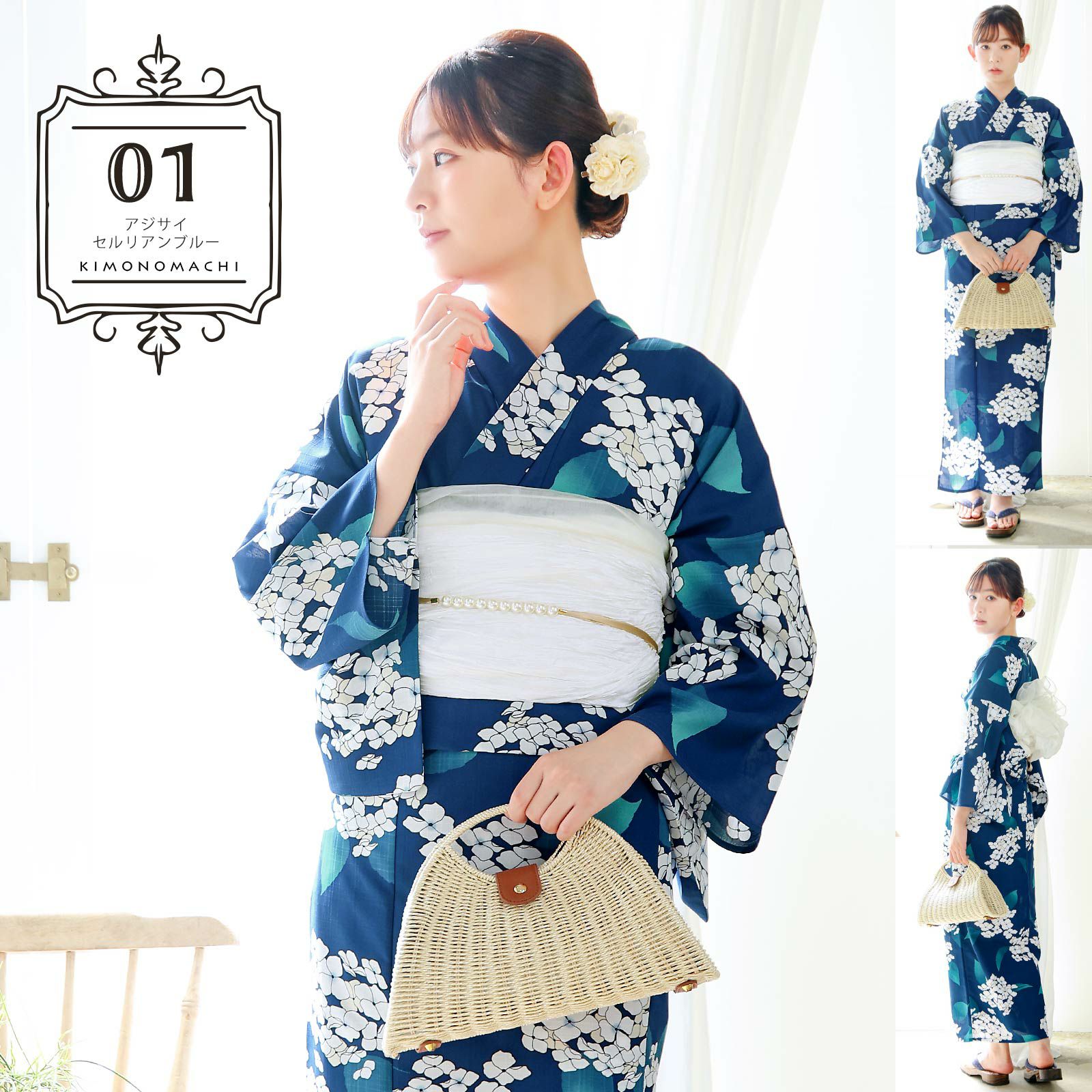 浴衣:ややグレイッシュな深い青の地にオフホワイトと淡いベージュのアジサイの花、ターコイズに浅葱色のぼかしの葉。花びらの淡い青のぼかしに蕊の深い紺色がさわやかな印象を添えています。