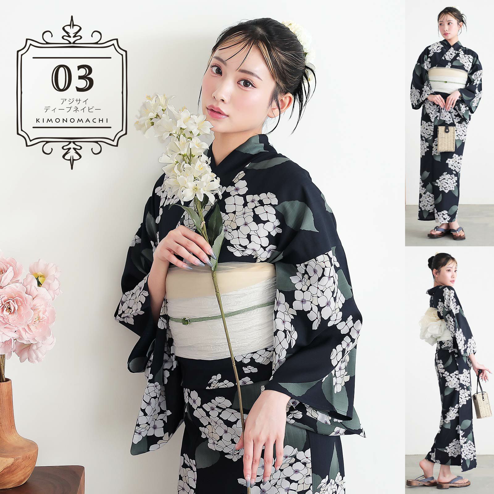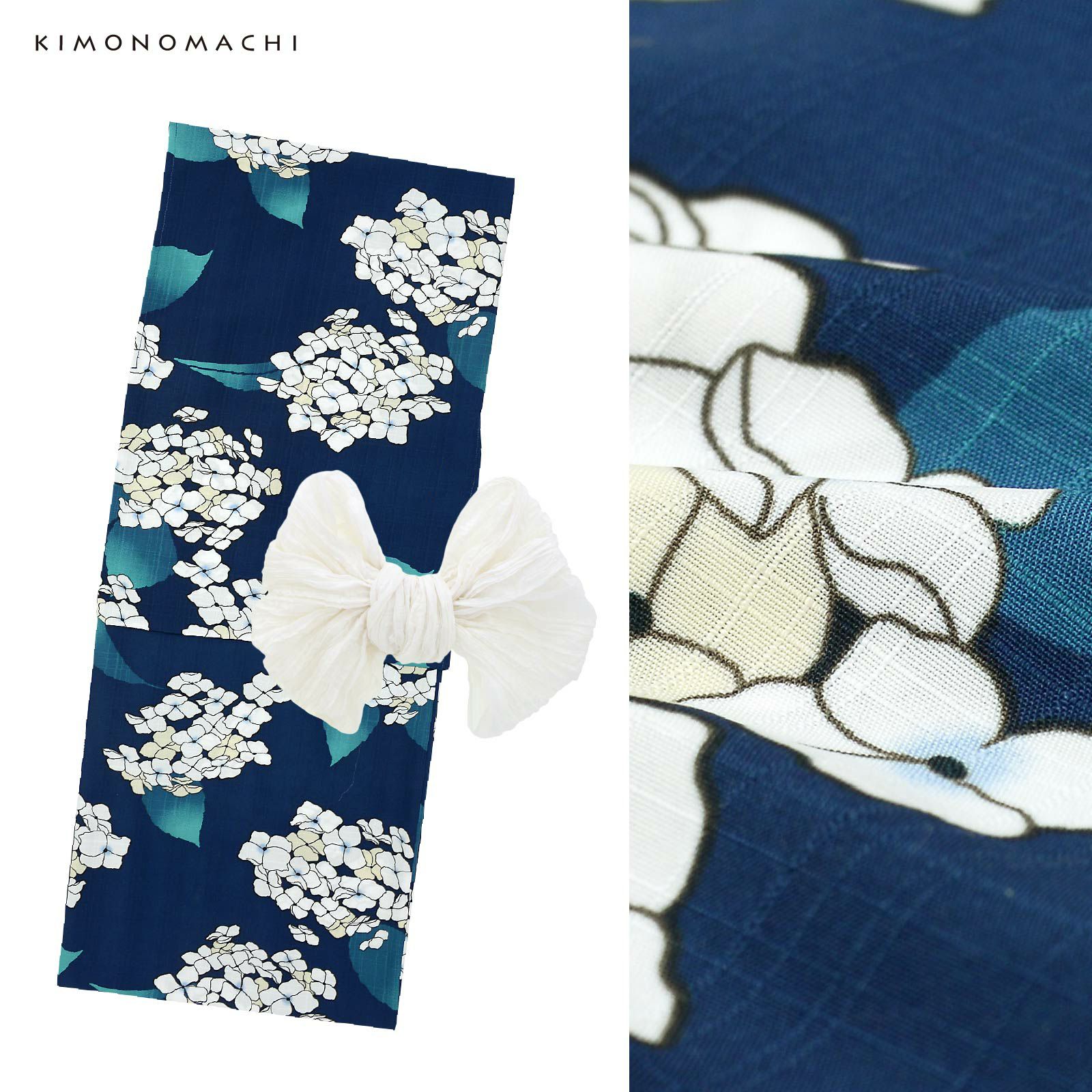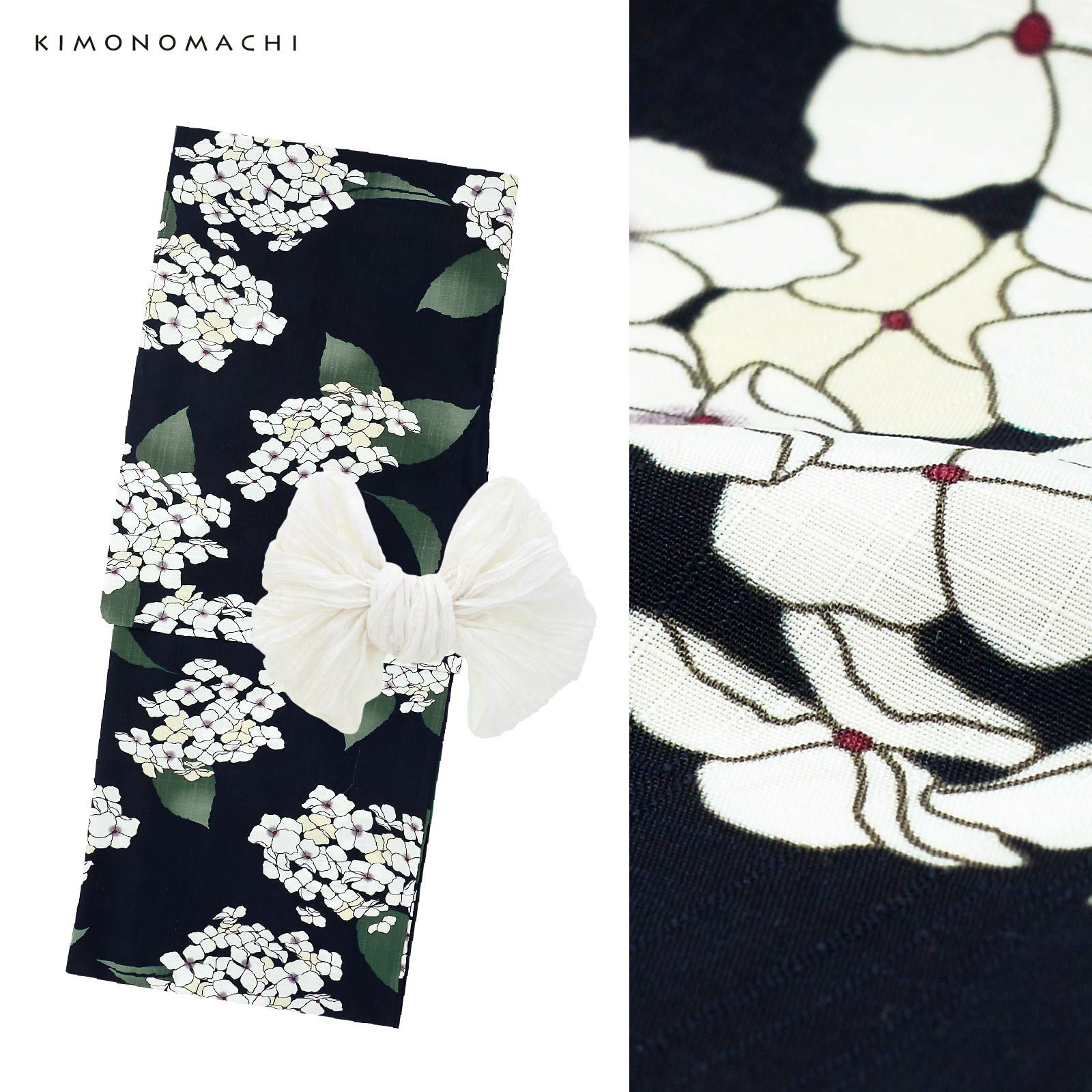 浴衣:濃紺の地にオフホワイトと淡いベージュのアジサイの花、グレイッシュな深緑のぼかしの葉。花びらの淡い紫のぼかしに蕊の深紅色が上品なアクセントとなっています。