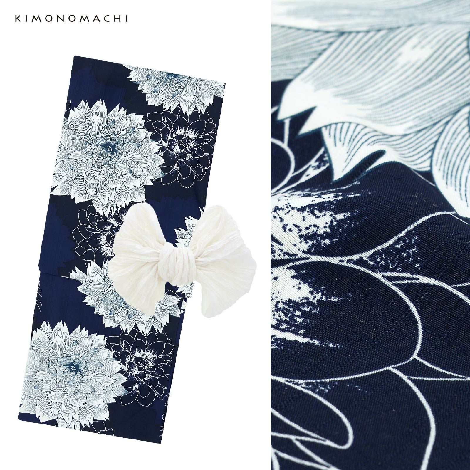 浴衣:深い紺地に、紺青の花のシルエット。藍色の線に白で表現された大輪のダリアの花。白の輪郭線で表現されたダリアが奥行きを与えています。