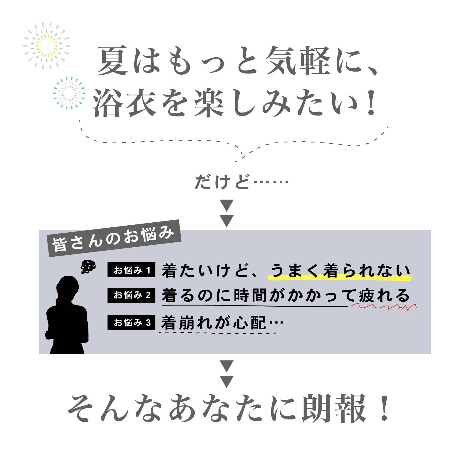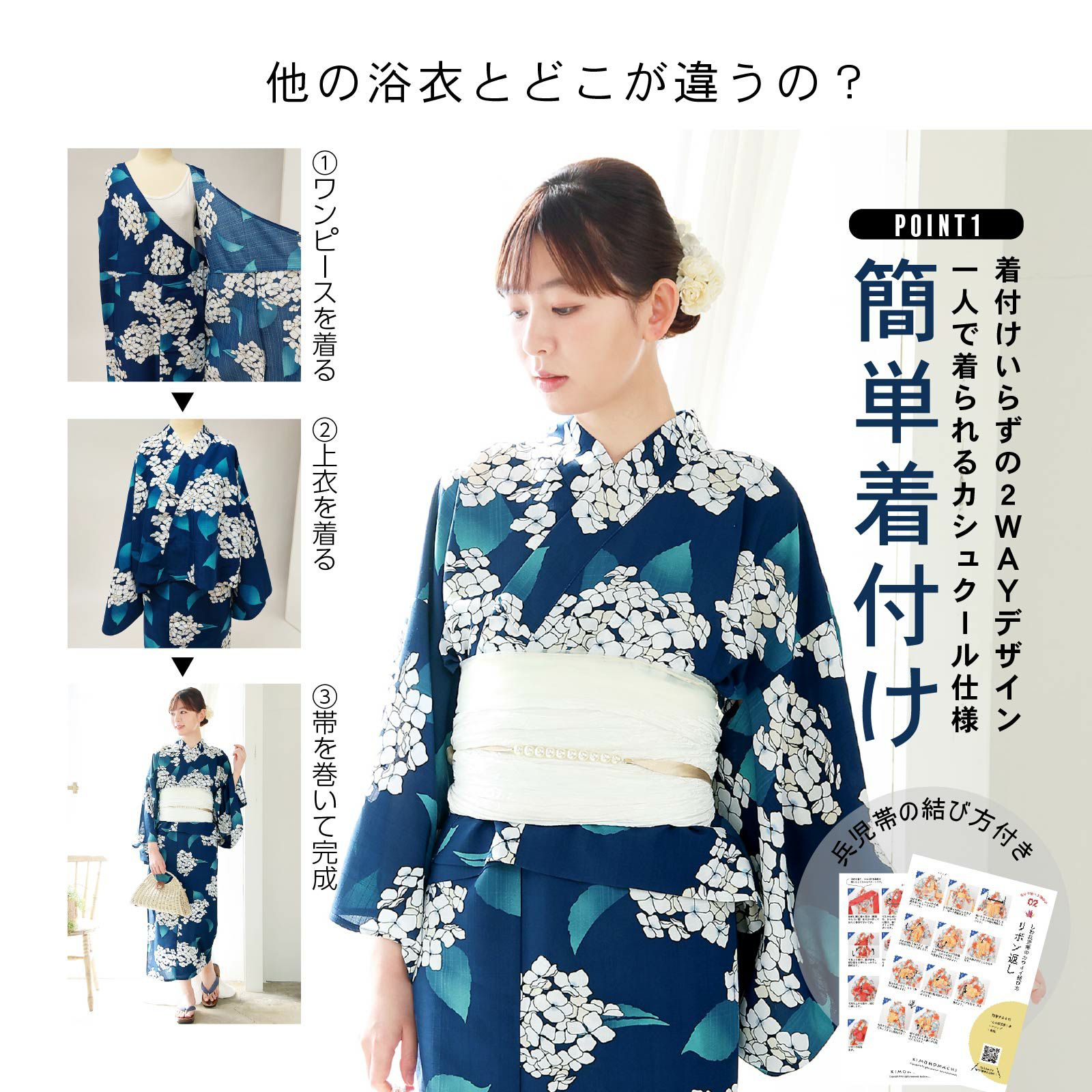 最大の魅力は、着付けが不要なカシュクールワンピース仕様であること。セットの帯を結ぶだけで、どなたでも簡単に美しい浴衣姿が完成します。