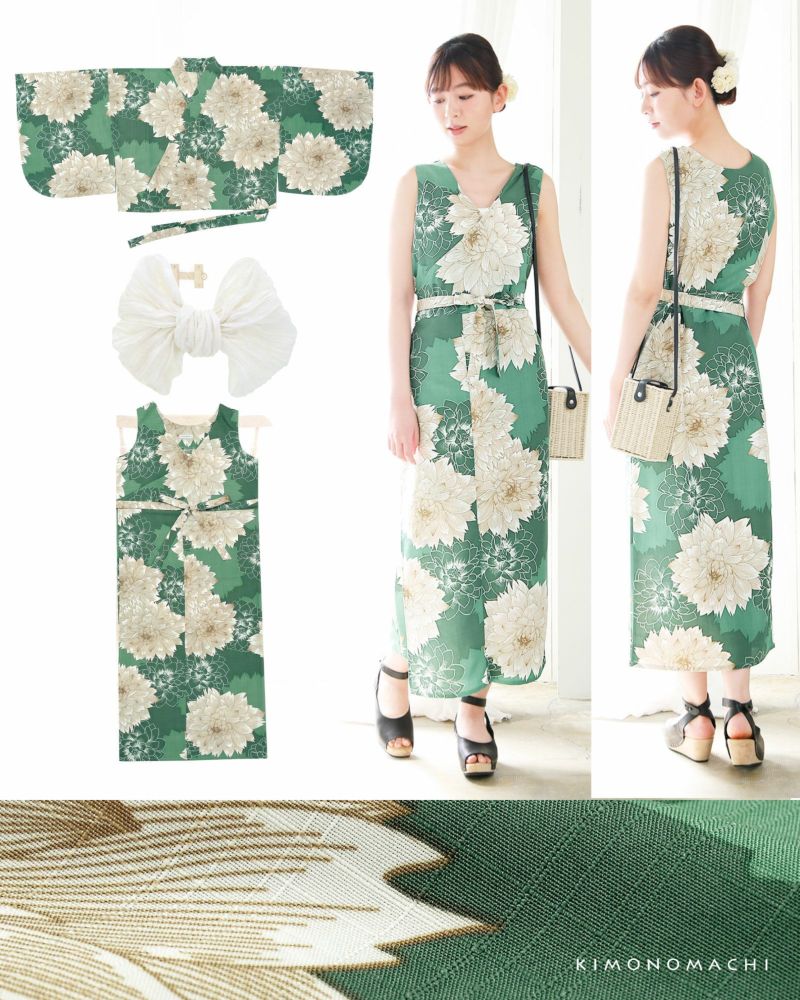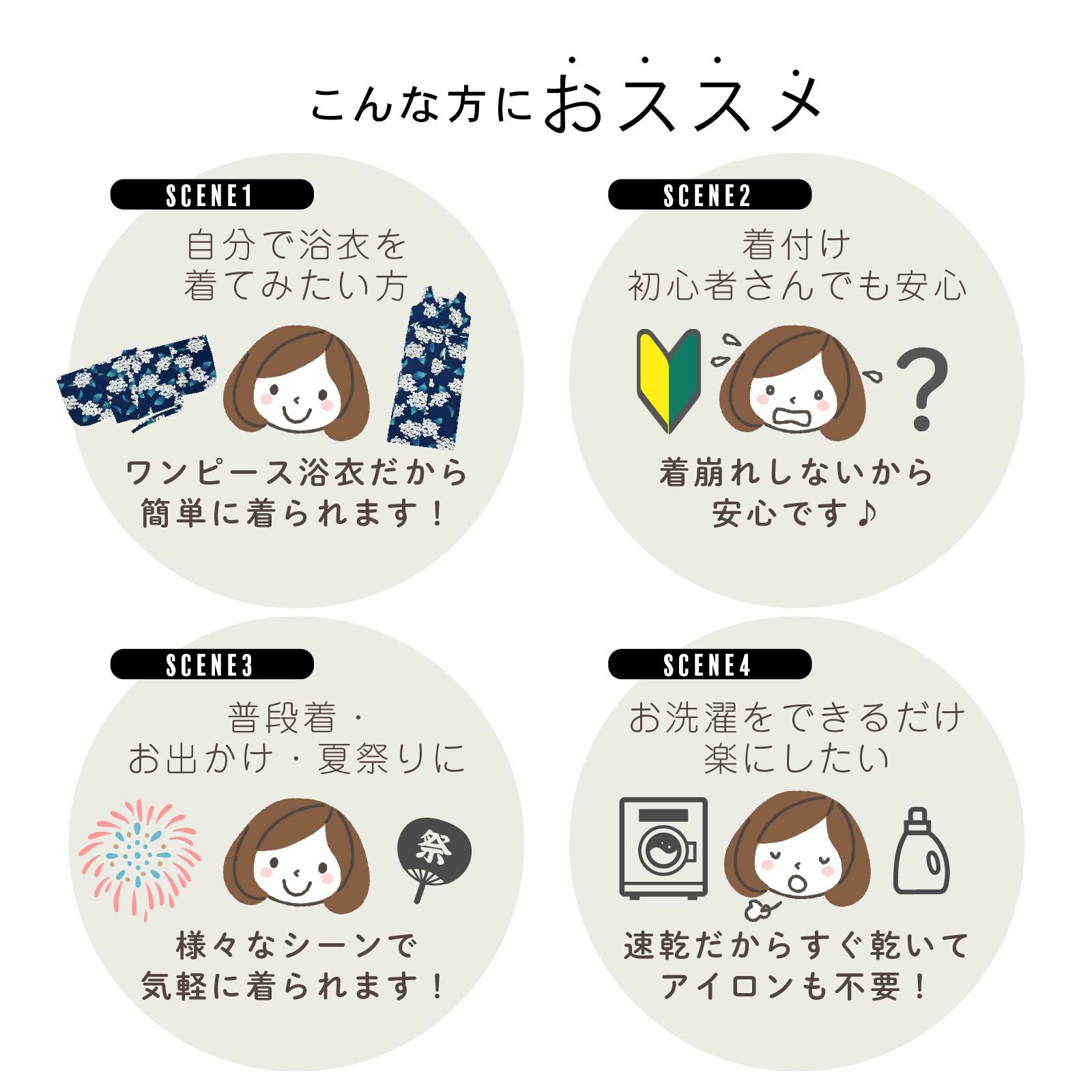 【着用シーン・季節】夏祭りや花火大会などの夏のイベントはもちろん、普段のおしゃれ着として、旅行先での散策など、様々なシーンで活躍します。着付けの手間がないので、思い立った時にさっと着てお出かけできるのが魅力です。