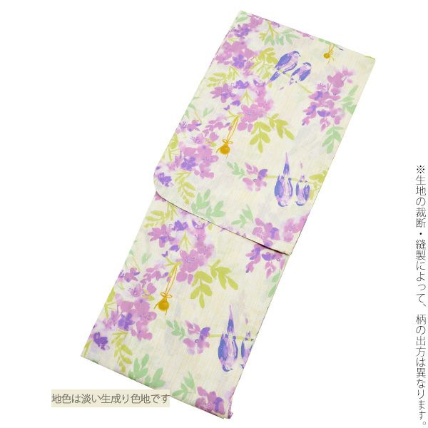 【カラー】浴衣は、小さな水玉の地紋。淡い生成り×薄黄色の細かな絣のような地に、水彩画のようなお花、小鳥、鈴の模様。帯は、鮮やかな濃い紫色に葡萄蔦模様。下駄は、鼻緒は白色地に黄色、ピンク、ブルーなどの色使いのストライプ模様。台は黒色の塗り。