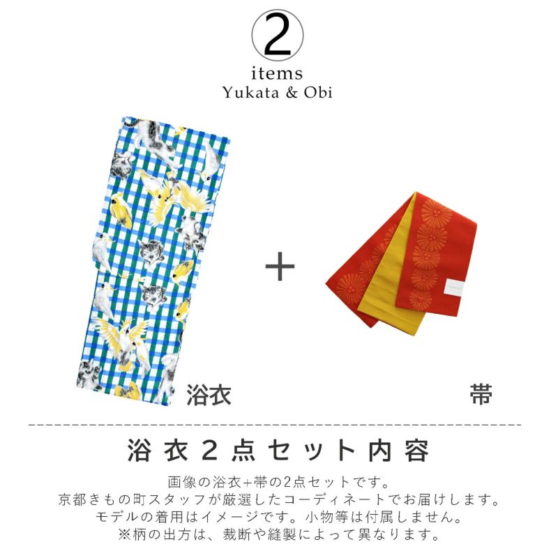 浴衣:白地に濃い緑色と水色の格子柄。格子が交差する部分が、濃い青色のアクセントになっています。格子の上全体に配された、表情豊かに動いているオウムとネコのイラストがとってもユニークで可愛らしい!中には寝ている子も。イラスト部分は、薄いグレーのラインで、猫は濃淡のグレー、オウムは白とクリームイエローの色使い。