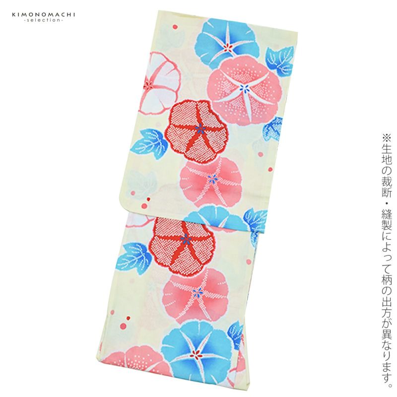 浴衣:淡いクリーム色地に、赤ピンク、ブルーなどの色使いの朝顔模様。