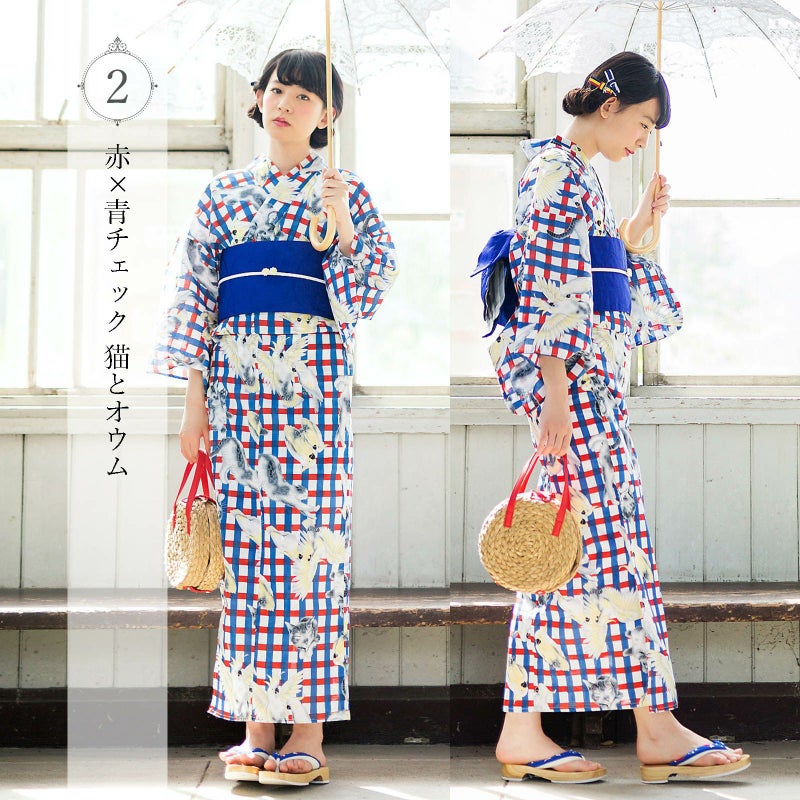 浴衣:白地に濃い青色と濃い赤色の格子柄。格子が交差する部分は紺色。格子の上全体に配された、表情豊かに動いているオウムと猫のイラストがとってもユニークで可愛らしい!中には寝ている子も。イラスト部分は、薄いグレーのラインで、猫は濃淡のグレー、オウムは白と薄いイエローの色使い。