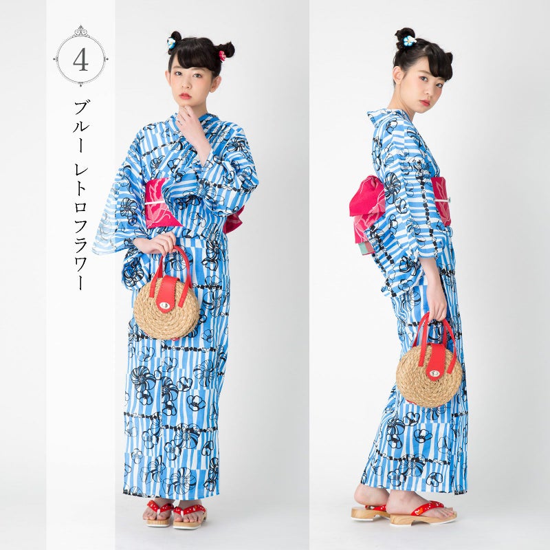 浴衣:白地に鮮やかな青色で、ややウェーブがかった不規則な太さの縦ラインがゆらゆら流れているよう。縦ラインの上に、はっきりとした黒色で、大小のポピーのようなレトロなお花と、小さなスクエアを連ねたような幾何学模様入り。