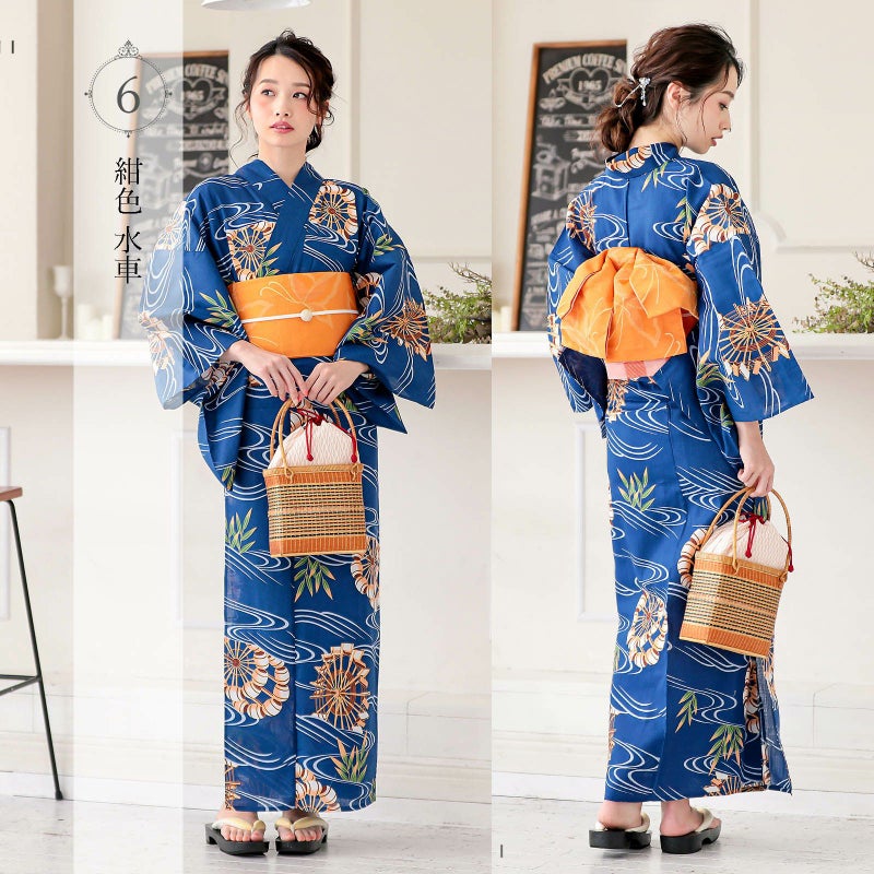 浴衣:濃い青色地に、水色の流水模様。水の流れの合間から、2種の水車と笹の葉が見えるのが涼しげ。水車の部分は白色とオレンジベージュに明るい茶色、ラインとところどころにからし色。笹の葉はオレンジベージュ色、一部に緑色がほんのりと。