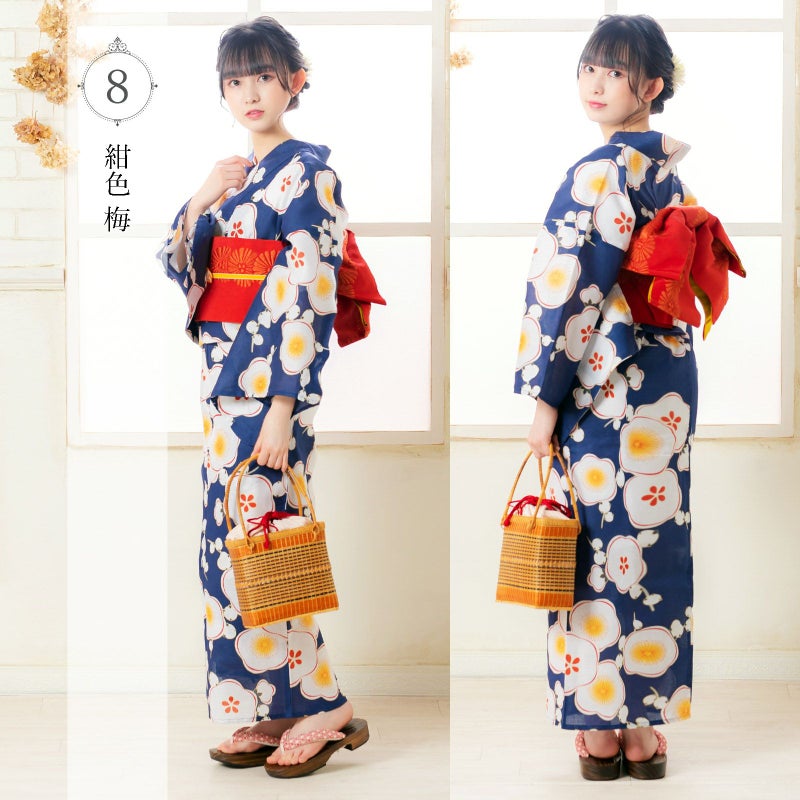 浴衣:紺色地に柔らかな丸みと曲線のある白い梅の花。花の部分には茶色がかった赤色のラインや、ところどころ色づいた黄色が使われています。花の間から少しだけ覗く枝の部分は薄いグレー。