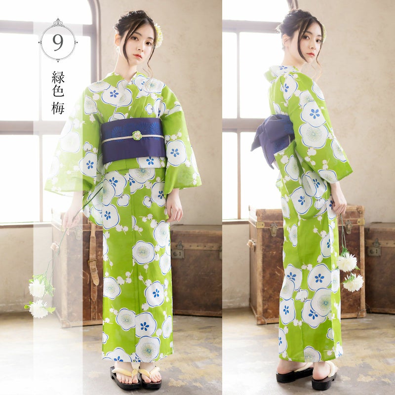 浴衣:濃い黄緑地に柔らかな丸みと曲線のある白い梅の花。花の部分には鮮やかな濃い青色のラインや、ところどころ色づいた黄色が使われています。花の間から少しだけ覗く枝の部分は薄いグレー。