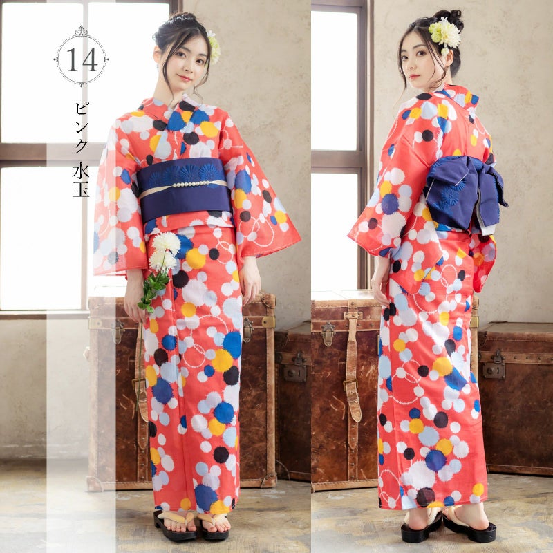 浴衣:深みのあるスモーキーなピンク色地に、重なり合う銘仙調の水玉模様。水玉は大中小のさまざまな大きさで、白色に黒色、濃い黄色に、ごく薄い水色、青色。シンプルながら、銘仙調ならではのレトロモダンでとってもオシャレ!