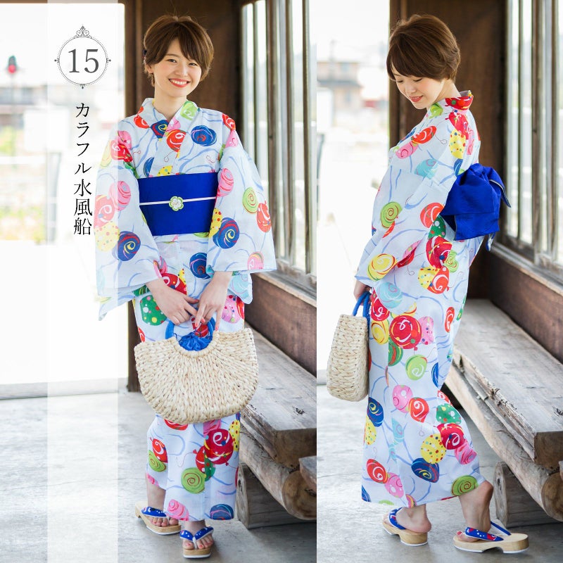 浴衣:薄水色地に水色の流水模様と、グリーンやピンク、ブルーと色とりどりの水風船がとってもカラフル&キュート!