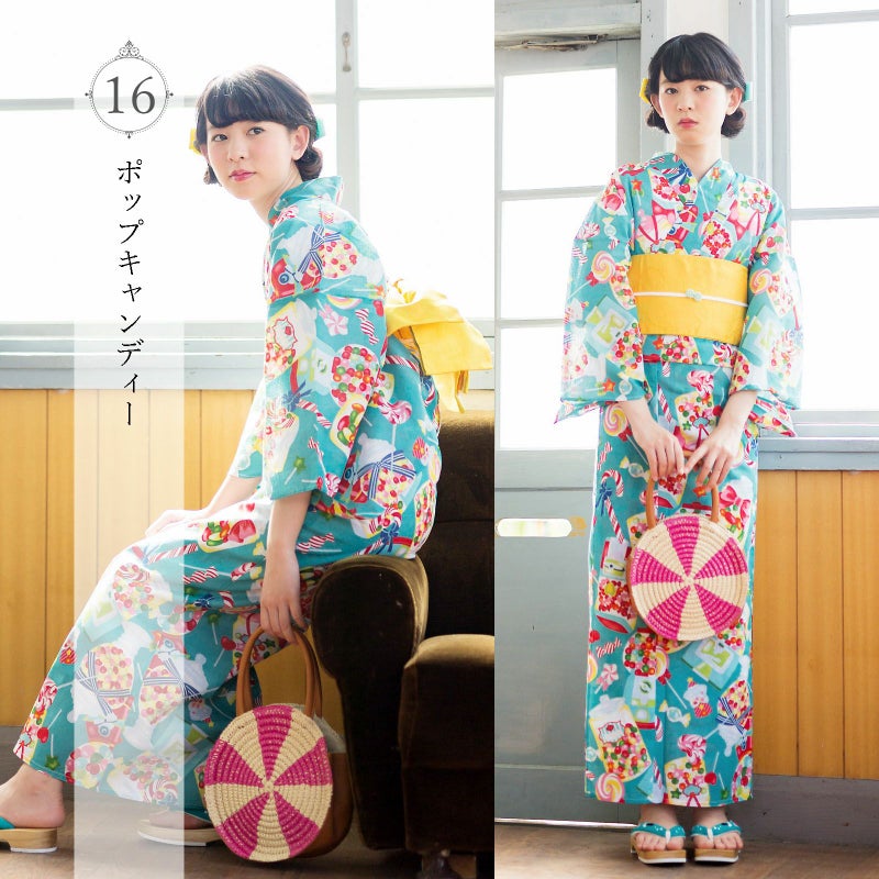 浴衣:青緑色地の上いっぱいに、赤・黄色・ピンク…色とりどりのキャンディーのイラスト。丸い棒付きキャンディーや、瓶いっぱいのキャンディーなど色んな種類のキャンディー重なり合った模様が女の子をハッピーな気分にしてくれます☆