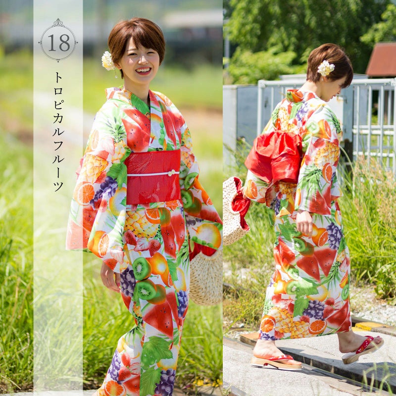 浴衣:ジューシーな果実の風合いもそのままに、カラフルなオレンジに苺、スイカ、葡萄、キウイにパイナップルのイラストが!重なり合ったフルーツの間から覗く白色地が爽やかです。真夏の陽射しに負けないくらい賑やかでキュートな一枚。