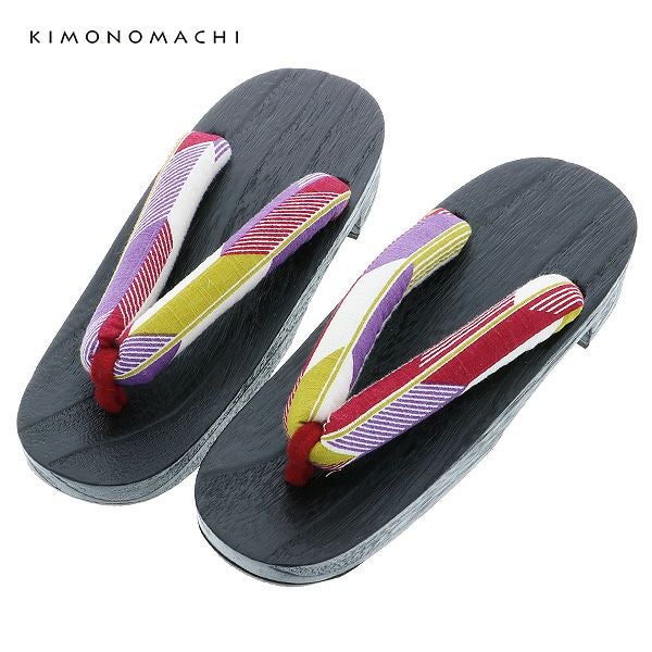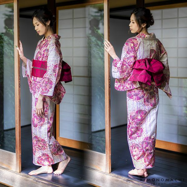 【カラー】浴衣は、白色地に、淡いパープルの縦ライン、赤ピンク系の色使いの幾何学模様のようなレトロなお花。帯は、濃い赤ピンク色×黒色の色使い、露芝模様。下駄は、鼻緒は白色地に紫、エンジ、くすんだ黄緑色の矢羽模様。台は黒色の塗り。