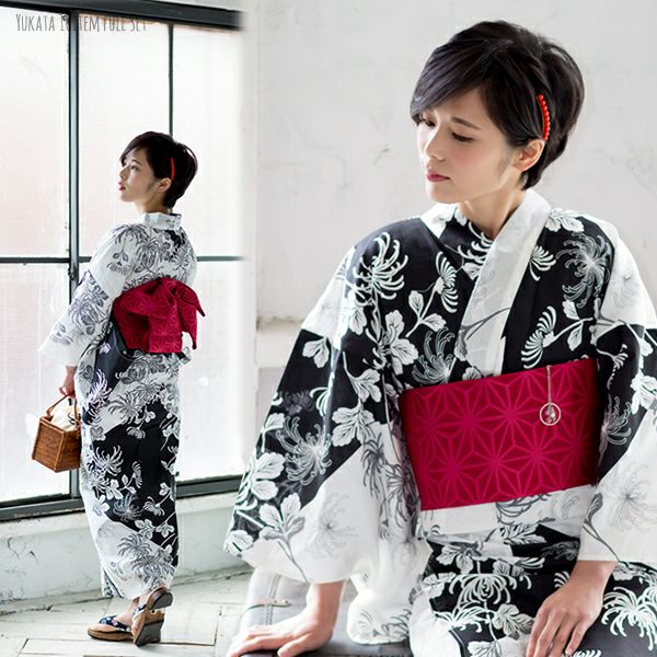 【カラー】浴衣は黒×白色に、菊花模様。帯は落ち着いた赤色。巾着は濃いエンジ色に細かな菱模様。竹籠部分は黒塗り。下駄は白色地に古典柄。台は黒塗り。