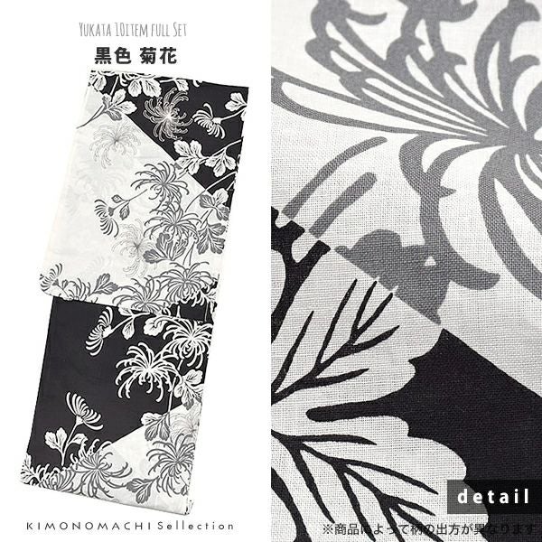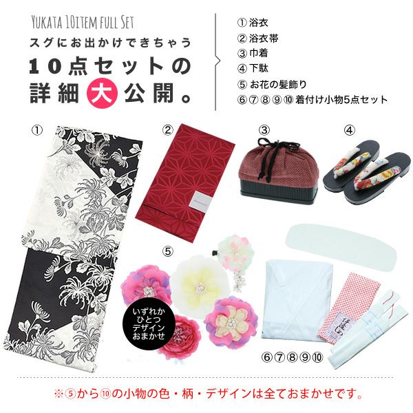 画像の浴衣、帯、下駄、巾着、浴衣スリップ、帯板、伊達締め、腰紐(2本)、浴衣飾り(お花飾り)の10点セットです。