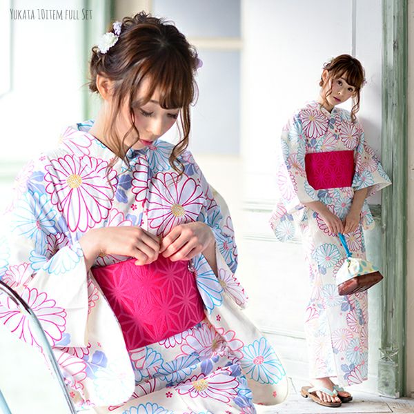 【商品内容】浴衣、浴衣帯、着付け小物セット(浴衣スリップ・浴衣用帯板・伊達締め・腰紐2本)、下駄、籠巾着、浴衣飾り(お花髪飾り)の計10点