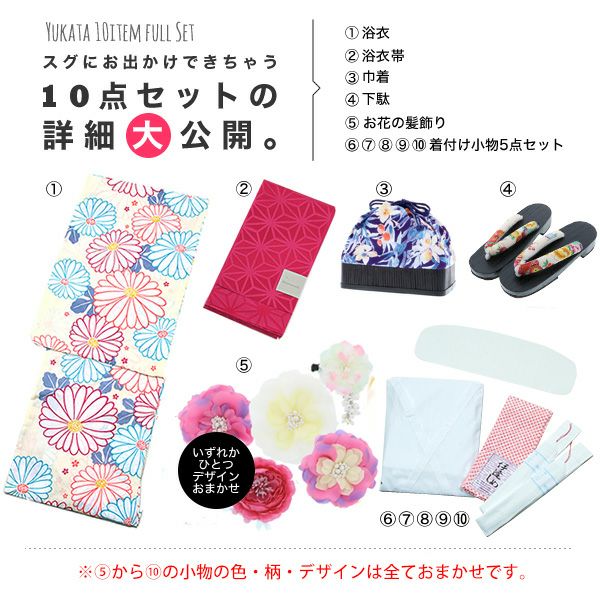 画像の浴衣、帯、下駄、巾着、浴衣スリップ、帯板、伊達締め、腰紐(2本)、浴衣飾り(お花飾り)の10点セットです。