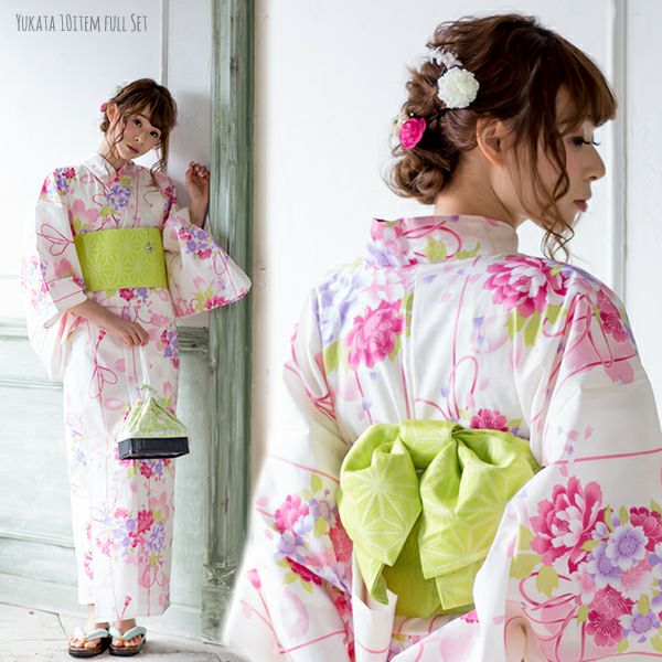 フリーサイズの女性浴衣、浴衣帯、下駄、籠巾着、浴衣着付けセット、浴衣飾りが付いた激安豪華10点セットです!!