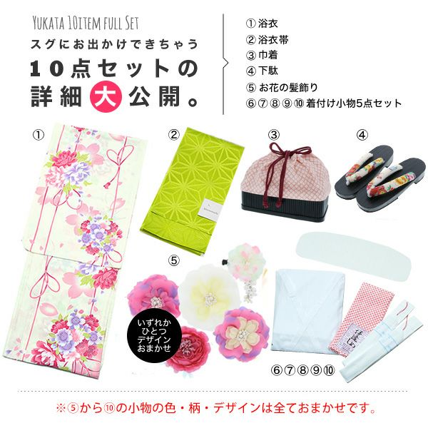 画像の浴衣、帯、下駄、巾着、浴衣スリップ、帯板、伊達締め、腰紐(2本)、浴衣飾り(お花飾り)の10点セットです。