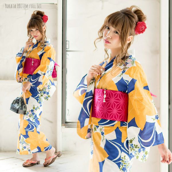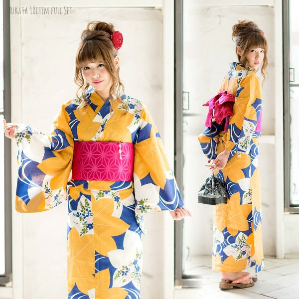 フリーサイズの女性浴衣、浴衣帯、下駄、籠巾着、浴衣着付けセット、浴衣飾りが付いた激安豪華10点セットです!!