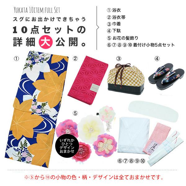 【商品内容】浴衣、浴衣帯、着付け小物セット(浴衣スリップ・浴衣用帯板・伊達締め・腰紐2本)、下駄、籠巾着、浴衣飾り(お花髪飾り)の計10点