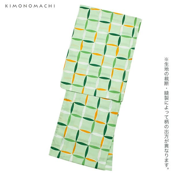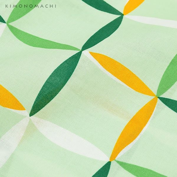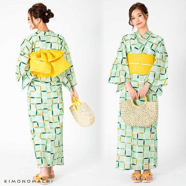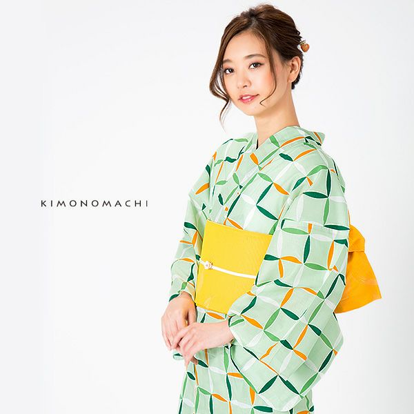 【カラー】浴衣は、明るい黄緑色地に、規則的に並んだ変わり格子模様模様。帯は、明るい濃い黄色。細かな縞に、大きな金魚の模様。
