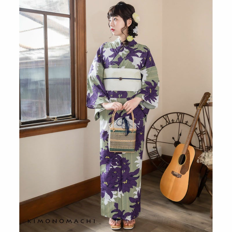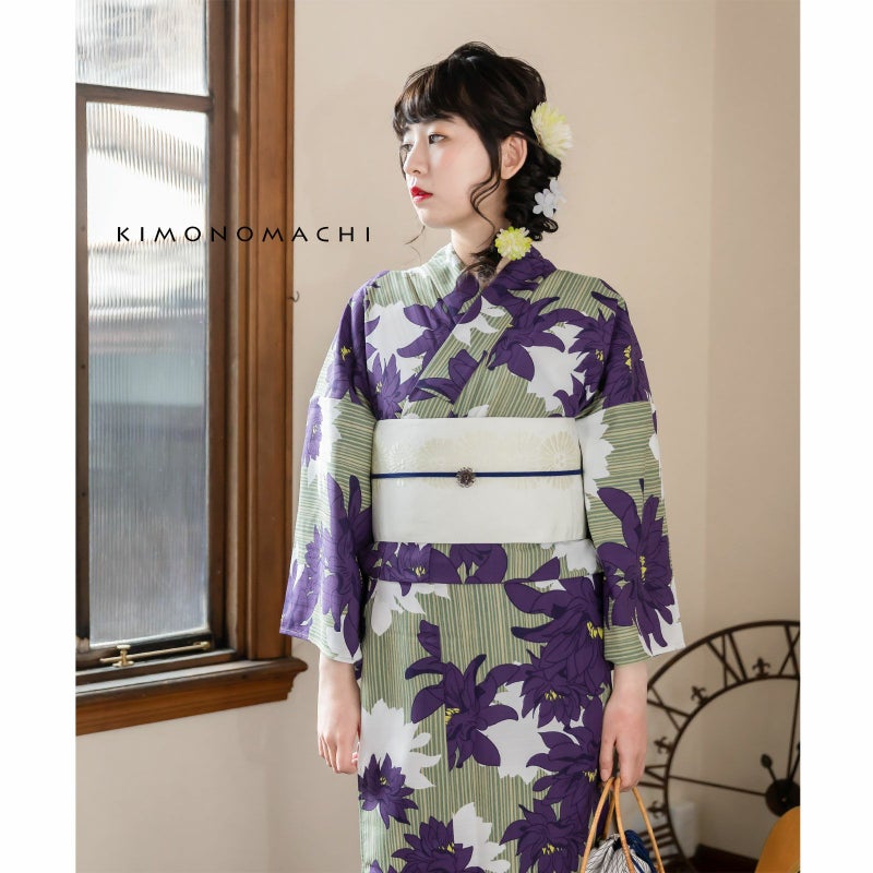 浴衣:ややグレイッシュな薄黄緑にモスグリーンの乱調のストライプの地、大きなダリアの花を散らしたデザイン。くっきりとした深紫のお花に、黄色の蕊がポイントです。白抜きのシルエットが奥行きのある印象に。