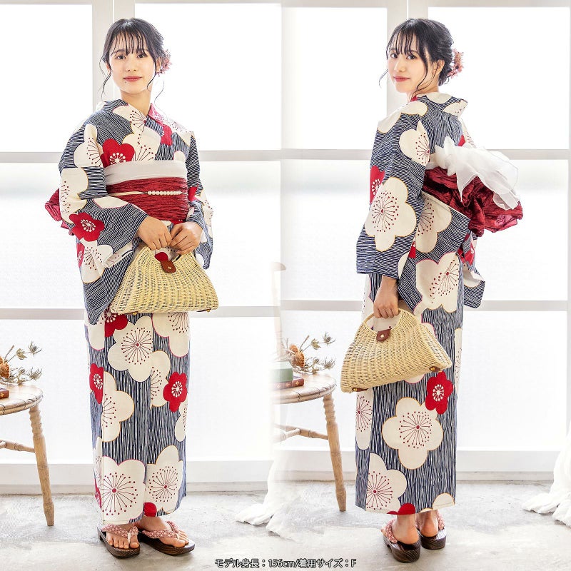 浴衣…紺色の細かな変わり縞に大きな梅のお花模様。